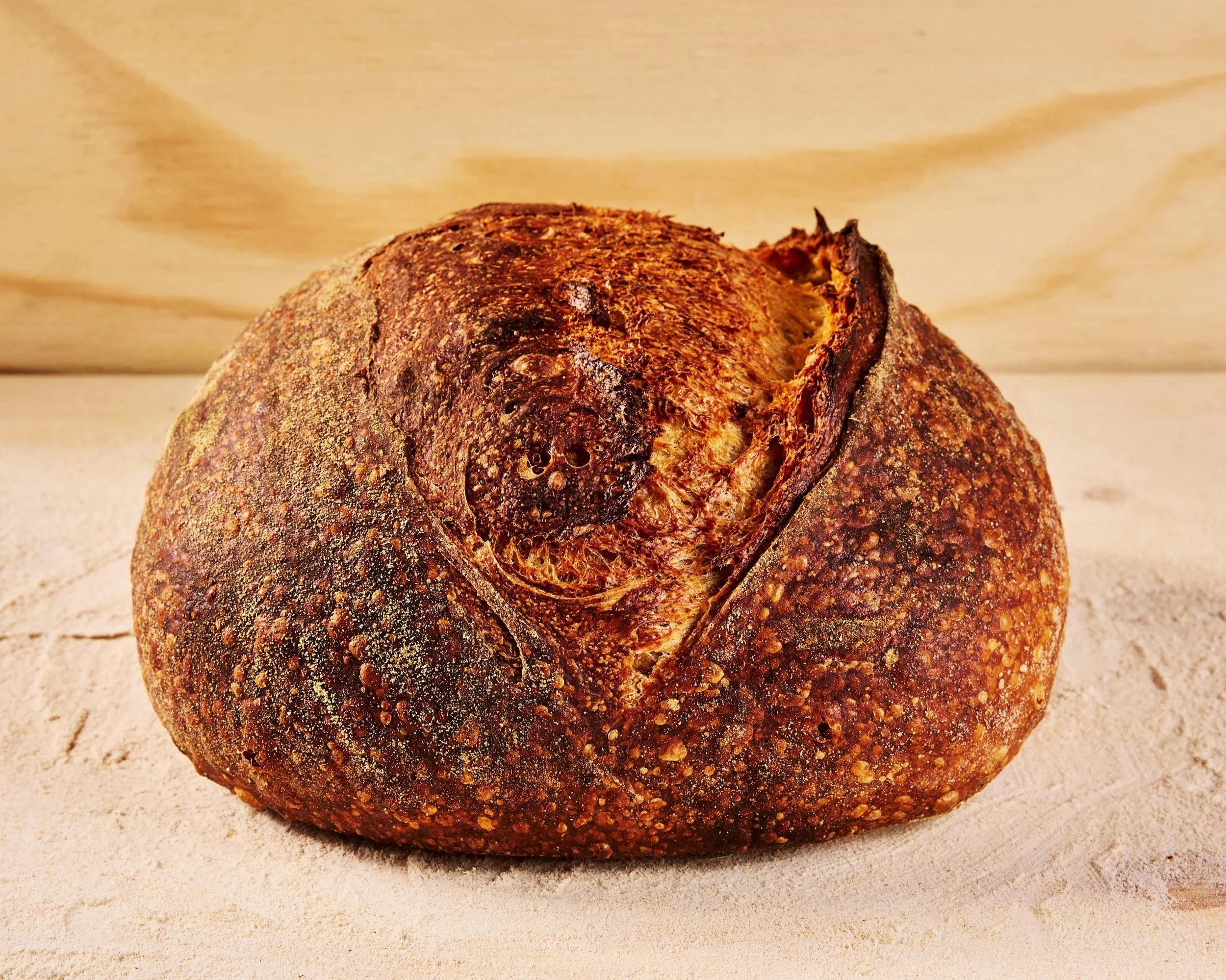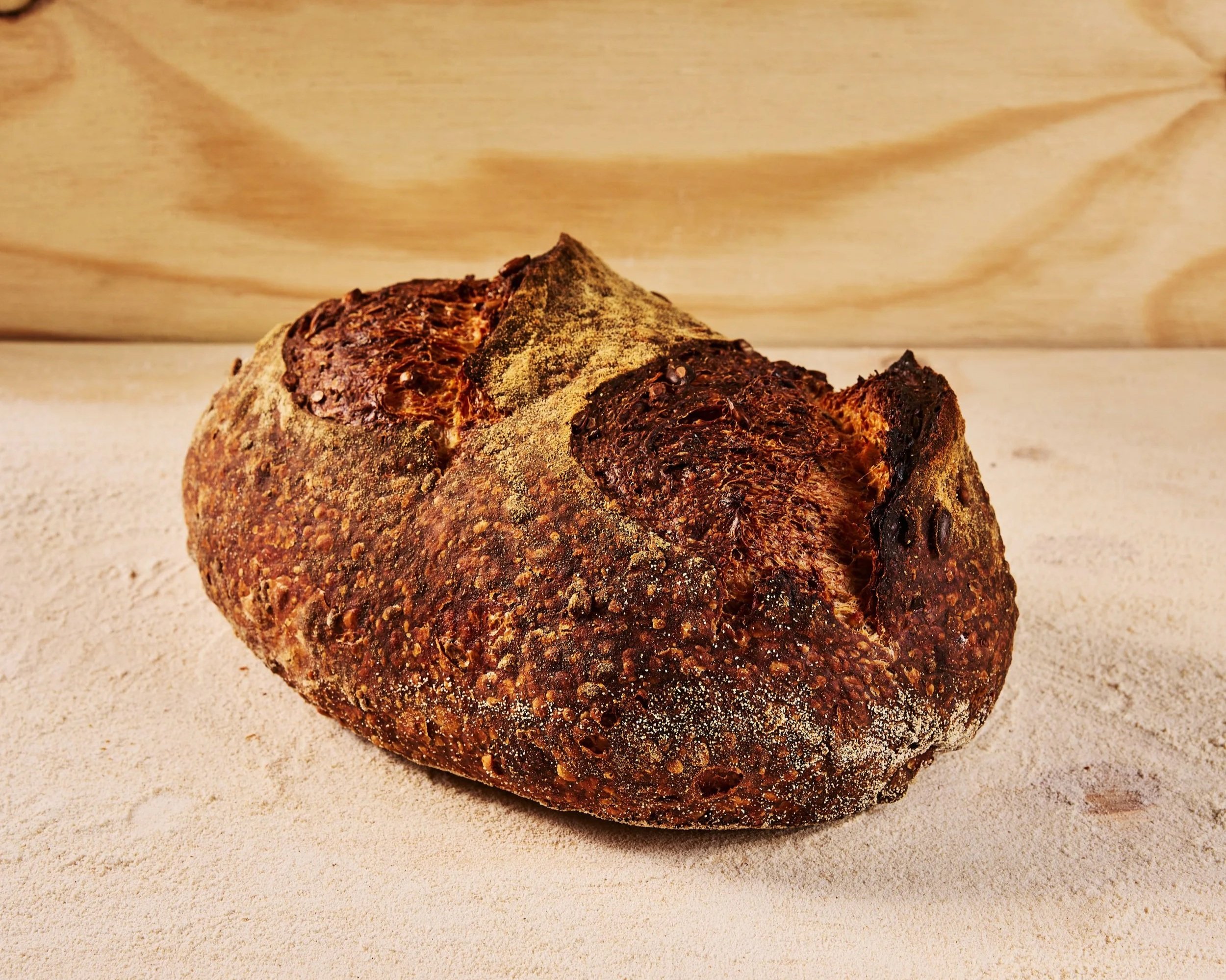 Our staple loaf. We use sustainably grown stoneground, heritage wheat flour, wholegrain emmer flour, a hint of spelt flour and some high protein bakers flour to achieve a loaf that is both soft and chewy, yet nutritious and delicious. We use high hydration and long fermentation to create a complex, full flavour with a moderately open crumb. A 950g freeform loaf.
